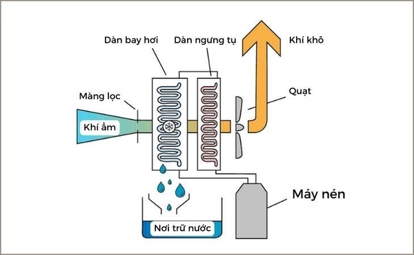 MÁY HÚT ẨM LÀ GÌ, NGUYÊN LÝ HOẠT ĐỘNG MÁY HÚT ẨM NGƯNG TỤ.