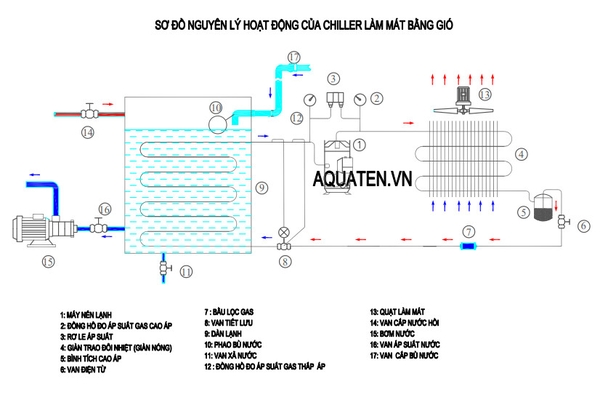Môi chất lạnh được máy nén đẩy với áp suât cao đi qua dàn ngưng, giúp giải nhiệt tốt ra môi trường hoạc được hấp thụ nhiệt bởi một môi chất hay thiết bị khác. Sau đó gas lạnh được đi qua van tiết lưu hay cáp để tăng áp suất đầu phun giúp cho gas sẽ đạt độ lạnh hơn và đi qua dàn giải nhiệt ( dàn lạnh) khi đó nhiệt độ nước được dàn lạnh giảm xuống hay nước hấp thụ nhiệt độ thấp của dàn lạnh